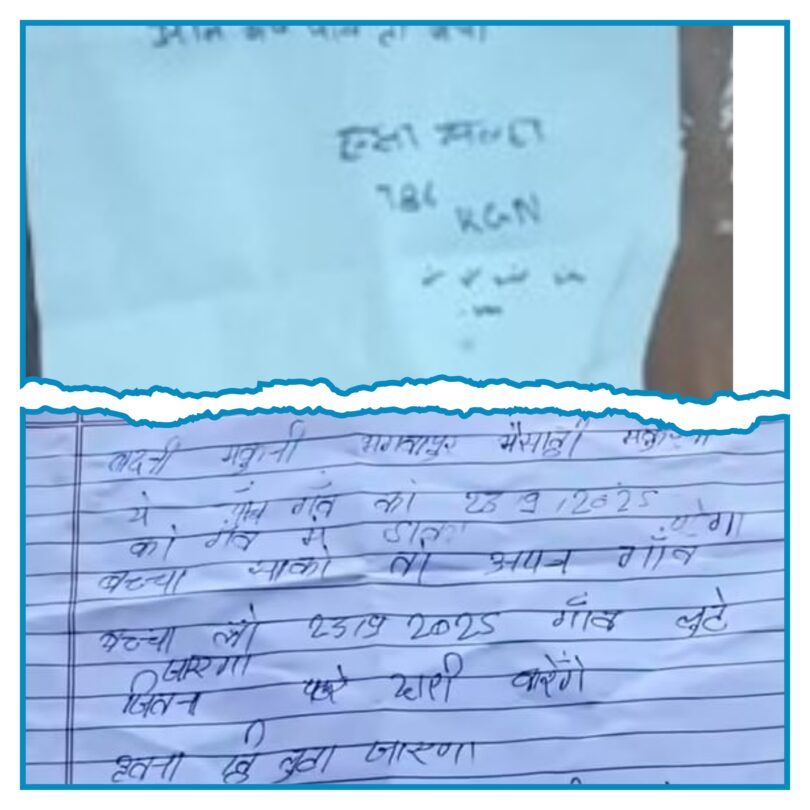 भ्रामक या असलियत जो भी हो ऐसी बातों को सुनकर पहले से ही डरे लोगों में सोमवार को मिले दो पर्चे ने दहशत और बढ़ा दी जिसमे गाँव में डकैती डालने की धमकी दी गईं थी। मामला शहर से जुड़े ग्राम बभनी क़ानून गो का है, जानकारी के अनुसार सोमवार की दोपहर यही के निवासी एक मिश्र परिवार के गेट पर एक पोस्टर लगा मिला जिसमे लिखा गया था की ” आज 22. 9. 2025 को मैं गाँव बभनी कानूनगो और जोगीबीर में डाका डालूंगा और कल मेरे बन्दे को चोट लगी है आज बच पाओ तो बचो”। पोस्टर लिखने वाले ने अपना नाम भी लिखा है साथ ही नाम के नीचे 786 और KGN लिखा है।