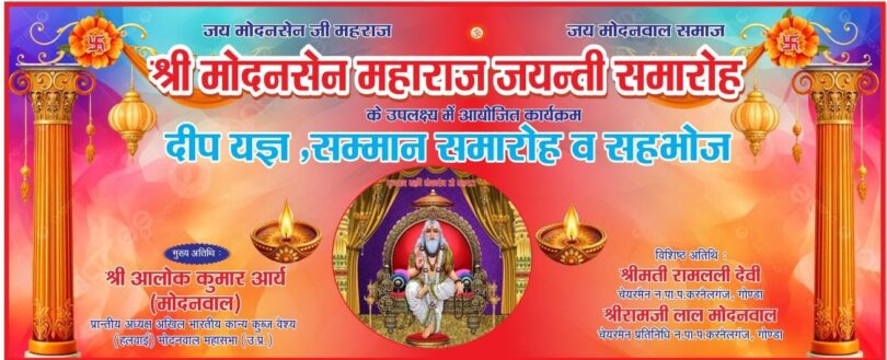 गोण्डा। रविवार को गोंडा गांधी पार्कस्थित संपूर्णानंद सभागार के प्रांगण में मोदनसेन महाराज की जयंती समारोह का आयोजन किया गया जिसमें गायत्री परिवार द्वारा दीप यज्ञ कार्यक्रम देव संस्कृति विश्वविद्यालय के छात्र विशेष वशिष्ठ इस पर साहिवाल मनीष शर्मा वी निशिका आर्य द्वारा संपन्न कराकर मुख्य अतिथि के रूप में हलवाई मोदनवाल समाज के प्रांतीय अध्यक्ष आलोक कुमार आर्य का स्वागत व अभिनंदन कर कार्यक्रम का शुभारंभ किया गया।