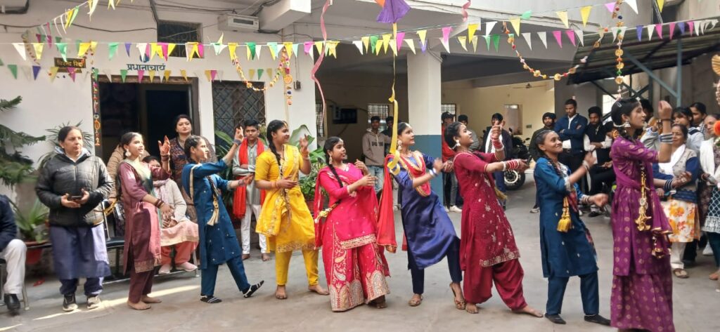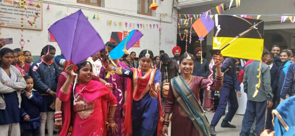 रंग बिरंगी स्वदेशी झालरों एवं पतंगों से सजे विद्यालय परिसर में कॉलेज की छात्राओं ने अपनी रंग बिरंगी पौशाक में ढोल की थाप पर मनमोहक भाँगड़ा नृत्य किया | छात्र -छात्राओं का उत्साह देखते ही बन रहा था |